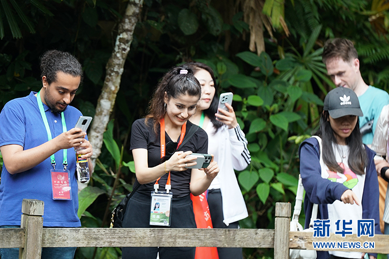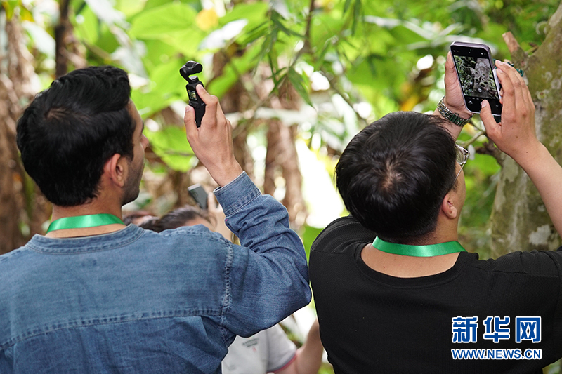 采访团成员在海南热带雨林国家公园五指山片区内参观、拍照。新华网发(刘正 摄)