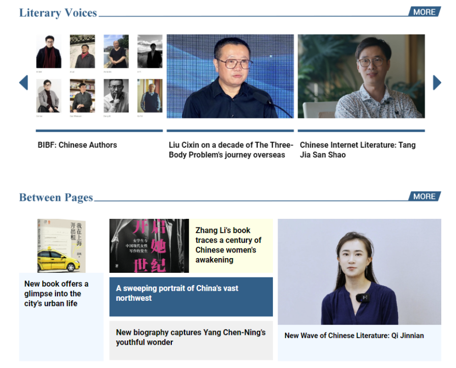中国日报网“中国文学”英文专页将邀请中外作家、评论人、知名学者和各国文学组织代表共同撰稿,以生动、立体的方式向世界介绍中国文学悠久传统和最新成果。专页将立足国际受众阅读习惯,以图文报道、视频访谈等多种形式,打造文学资讯、作家心语、字里行间、书游中国和中国文学海外读者俱乐部等特色栏目,及时报道中国文学最新动态、组织作家深度访谈、介绍中国文学精品佳作、展示作家视角下的中国故事,搭建起中外读者互动交流的桥梁,全方位展现中国文学的发展成果与当代风貌。专页还将提供与移动终端适配的页面体验,让读者可随时点开“指尖上的中国文学宝库”,畅享中国文学之美。